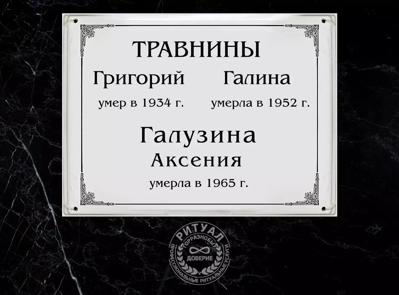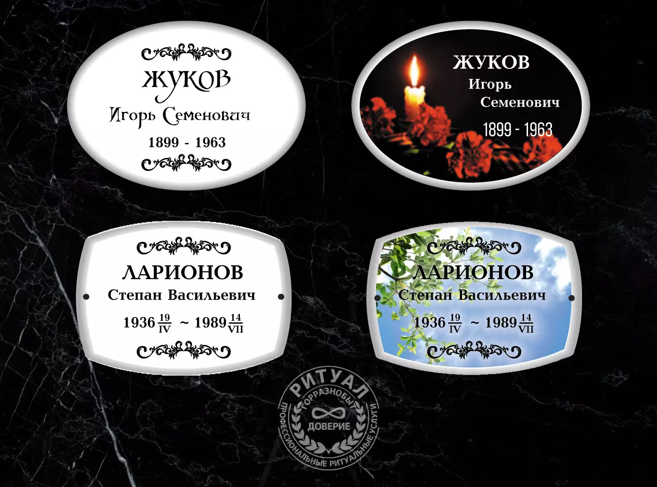Создайте память с помощью наших табличек. Таблички могут быть на металле, керамике и стекле. Гарантируем бережное отношение к фотографиям Ваших близких.
